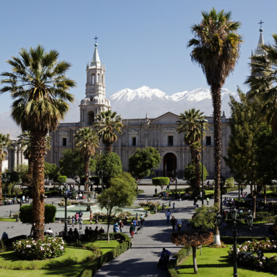 Arequipa liegt weit südlich von Lima in einem fruchtbaren Tal zwischen Wüste und Gebirge. Einst war es wichtigte Bahnstation auf der Verbindungsstrecke der Silberminien Boliviens und der peruanischen Küste. Die „weiβe Stadt“ ist das zweigröβte urbane Zentrum Perus und mit seinen prachtvollen Kolonialbauten aus „weiβem“, vulkanischen Sillar-Gestein ein touristischer Höhepunkt. Einer Legende zufolge war der Inkaherrscher Manco Capac auf einer seiner Reisen von der Schönheit des Tales so angetan, dass er sein Gefolge mit den Worten „ari quipay“ (ja, hier bleiben wir) anhalten ließ und die Stadt gründete.